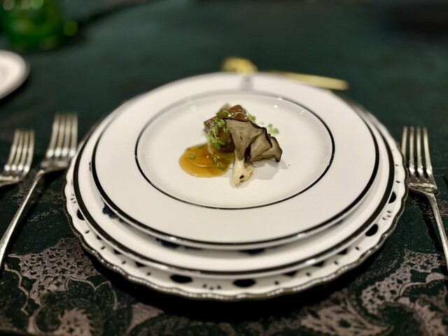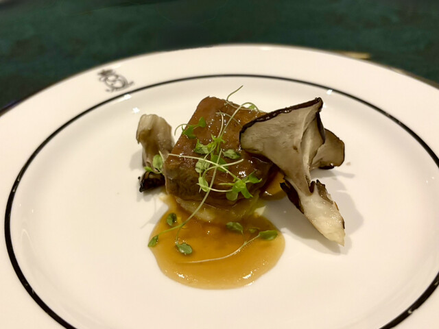 イタリアの煮込み料理。とろっとろの牛タンに、ソテーした黒舞茸、上にはマイクロセロリ、下にはキノコや赤ワインのソース、リンゴのピューレです。