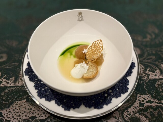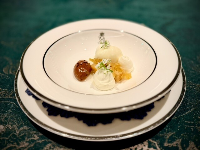 ナポリ発祥の伝統的焼き菓子のババに、リンゴソースとピューレ、ローズマリーの爽やかなジェラートを合わせています。