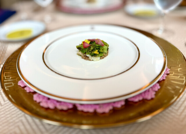 甘鯛の鱗と皮のパリパリがナイフを入れた時は勿論、お口の中でもサクサクで、身はふっくら柔らかく仕上げています。魚貝のお出汁と生海苔を合わせてスープにしています。