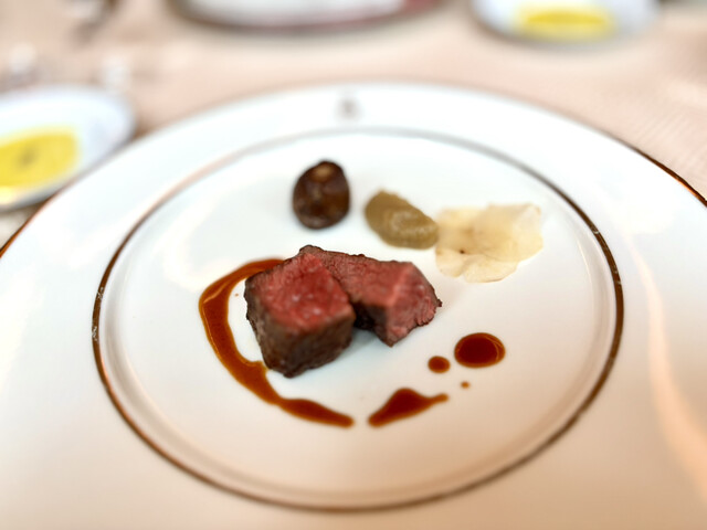 卵黄を絡めた神石牛とトリュフ、香ばしく焼けた
