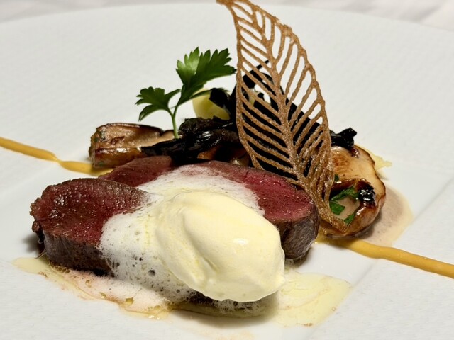 鹿のローストにホイップバターを、ポルチーニ茸のソテーとマッシュポテトを添えています。