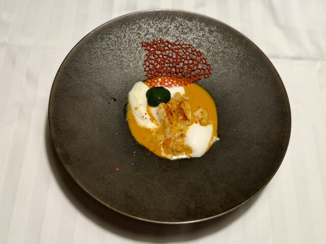 カリフラワーのピューレと海老のチュール添え