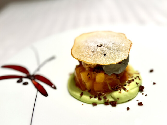 トンガ豆のアイスをのせた柿のデザートです。
