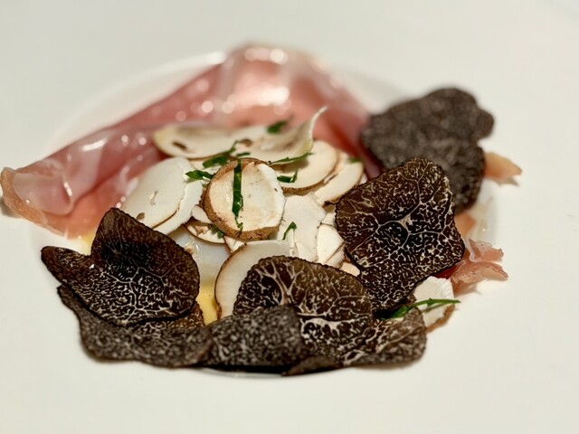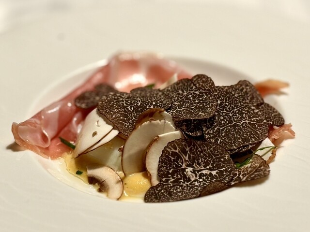 ●温玉とシャンピニオンの一皿、トリュフ