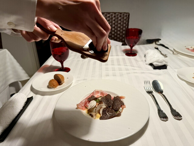 テーブルにて、黒トリュフを上から掛けます。