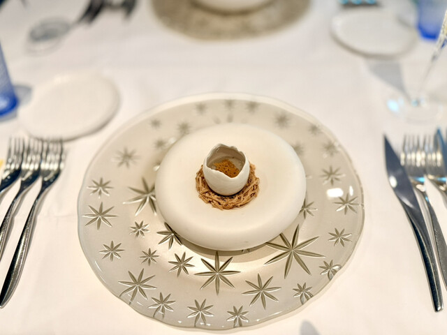 たまごの殻に見立てた容器に里芋と牛蒡のペーストを詰め、鰯の魚醤のチップスを中央に。