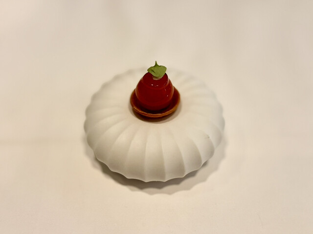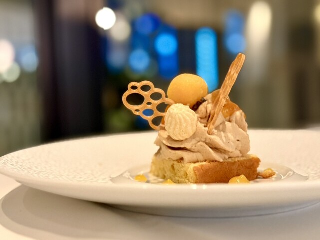 芋のペーストをムース状にして栗粉のクレープ生地はカリカリに焼き上げ、メレンゲや柿、ジェラートを添えています。