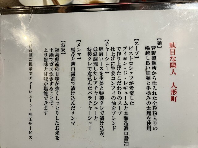 人形町で「ちょっと変わったラーメンを食べたい日」に、思い出して立ち寄りたくなる一軒です。