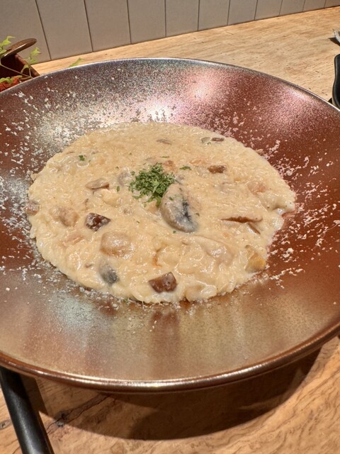 まずは前菜から始まり、彩り豊かな一皿が目を楽しませてくれました。そして、低温調理で仕上げられた柔らかな牛肉が印象的で、ソースとの相性も抜群。口に入れると肉の旨味がしっかりと感じられ、上品な味わいが広がります。また、リゾットはクリーミーで程よいチーズの風味が効いており、満足感のある一品でした。