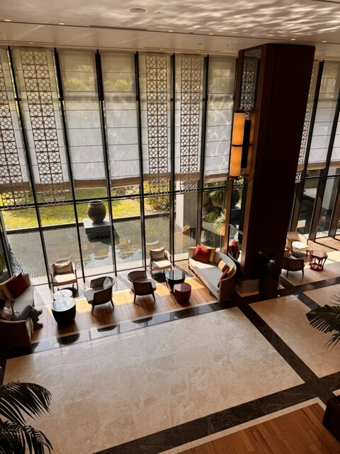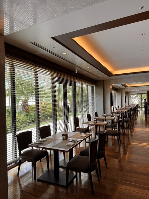 レストラン「Sakurazaka」は、洗練された雰囲気と明るい自然光が印象的で、まるでリゾートの中にオフィスラウンジを持ち込んだような空間。