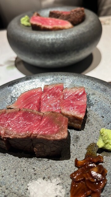 まるで大理石の模様かと惑わせてくれる黒毛和牛のたたきは、脂の光沢にキメ細かな肉質を備えお口の中で簡単にとろけていきました。