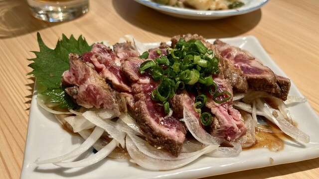 赤身肉って脂とのバランスの良さをつくづく感じるのだけれど、ウヱキの牛たたきは加えてお肉の上品な甘さにもウットリする。。