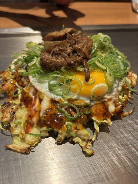ねぎ焼、ビジュアルが良すぎる!半熟のたまごがいい感じです。お好み焼きに甘辛い牛すじがのっている、どて煮とお好み焼きが融合したような一品。たまごのまろやかさもあってすごく美味しかったです!写真見返すとまた食べたくなってきます。