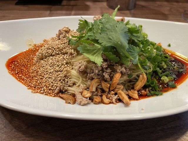 濃厚な胡麻の風味とパクチー、ナッツの食感がアクセントとなり、さらに山椒の痺れる辛さが絶妙で食べ進めるごとにどんどん旨みが増し、箸がとまらなくなってしまいました。