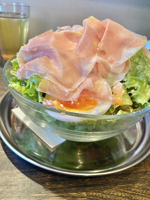 大きいサラダに自家製?ドレッシングをたっぷりと掛けてモグモグ。生ハムとサラダやドレッシングが合って美味しい。これだけ食べ続けたいくらい٩(>ω<*)وサラダの野菜も色々な種類があり大満足出来るランチサラダ!