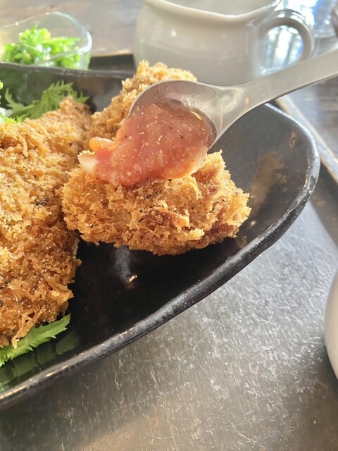 まずは、サルサソースを付けてカキフライをパクリ。サクサクの衣が揚げたてで美味しい!衣自体が美味☆カキも柔らかく、サクサク衣とも合い食欲が増加します♡サルサソースはどーだろ?と思っていましたが合う!合うよりの合う☆