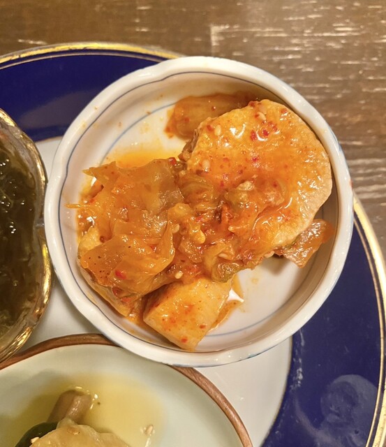 待つ事、5分くらいで前菜三種盛が到着しました☆もずく。長芋キムチ。田舎漬けのセットでした美味しいそう\( *°ω°* )/ヤッタ-!!