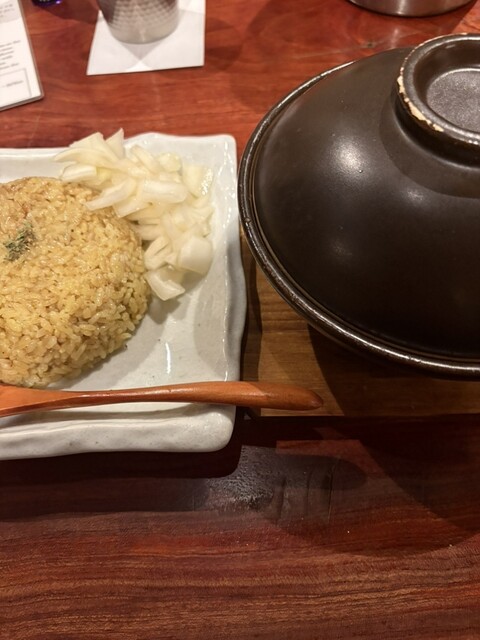 最後は残ったライスと玉ねぎのピクルスを土鍋に入れて、温泉卵とトマトを潰して、少し残ったカレーたちと一緒に混ぜてリゾット風に。