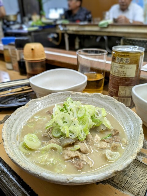 焼きたてのもつ焼きを頬張れば、香ばしさと脂の甘みが酒を呼ぶ。味噌仕立ての煮込みは優しい。