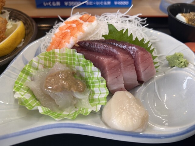 お刺身は鰹•帆立•カワハギの肝和え•ボイルえびです。すべてにおいて手の込んだ定食でした!