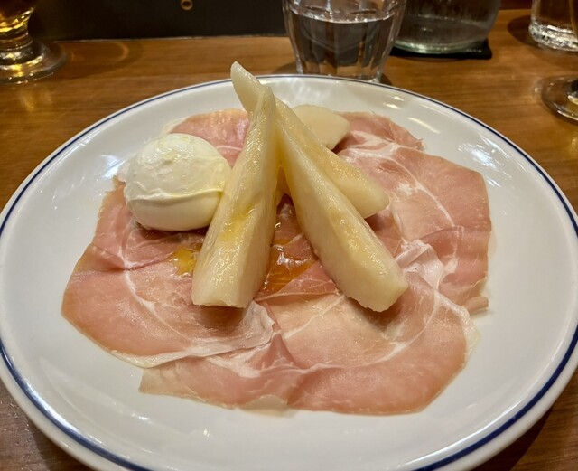 果汁が瑞々しい洋梨と生ハムに、水牛モッツァレラチーズを乗せて頂き、もう最高に美味しい!