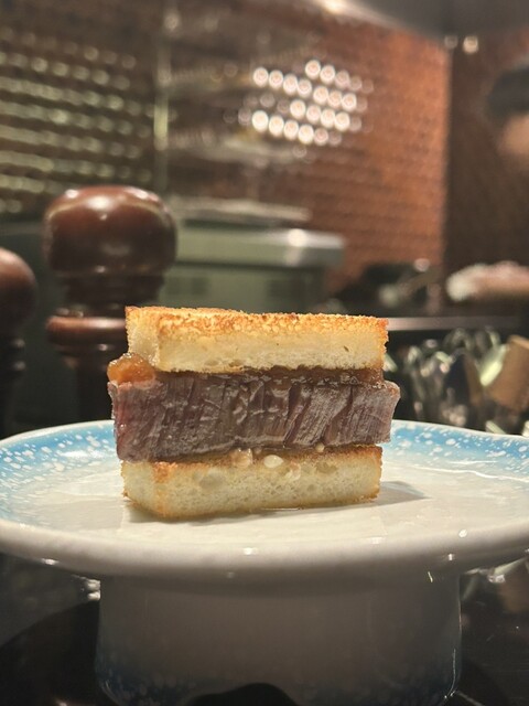 甘めのデニッシュパンに、マスタードとシャリアピンソース。サクサクの甘しょっぱいバンズと、噛み切る必要がないほど柔らかい肉の組み合わせが最高。赤ワインを飲んだ口で合わせると、さらに味が締まって美味しかったです。
