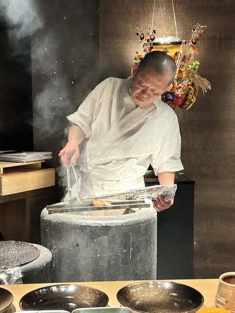 シャッターチャンスですよ!という大将に言われてカメラを向けると、黒ムツの皮目を炭で直接焼くところが見られます✨