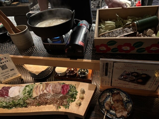 水炊きは、店主から材料のご説明、投入から器に盛り付けまで…スープが美味しい〜天草大王の餌がトウモロコシらしく、だしの効いたコーンスープな感じで締めは雑炊◎