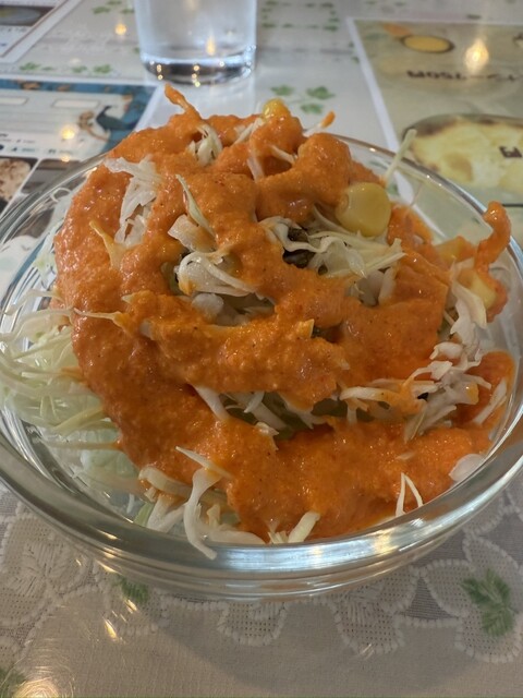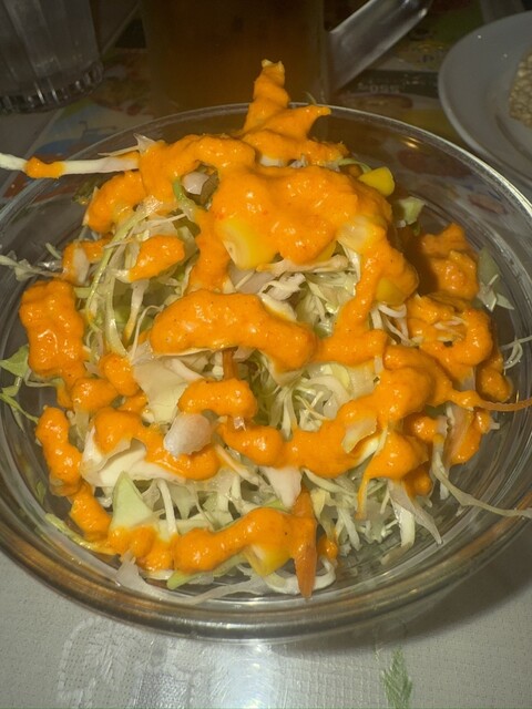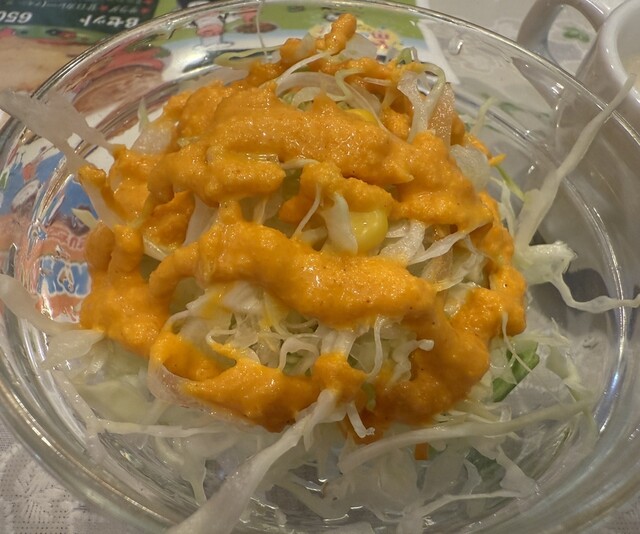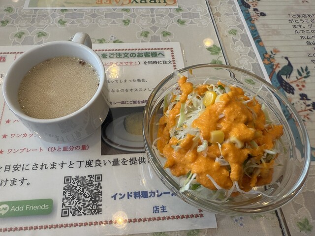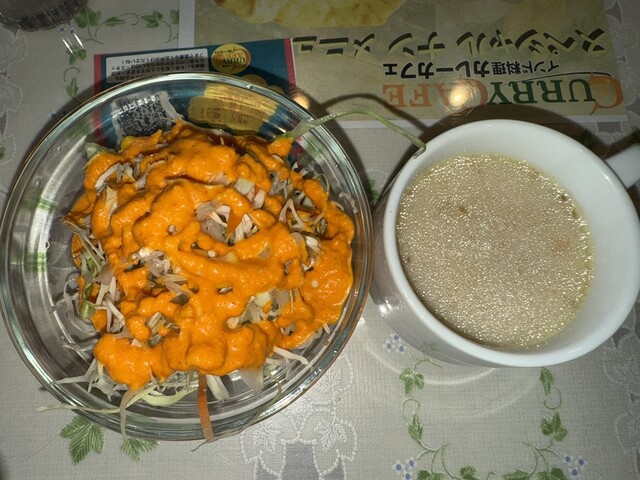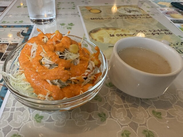サラダ、ドレッシング甘くて美味しい、チキンスープも美味い