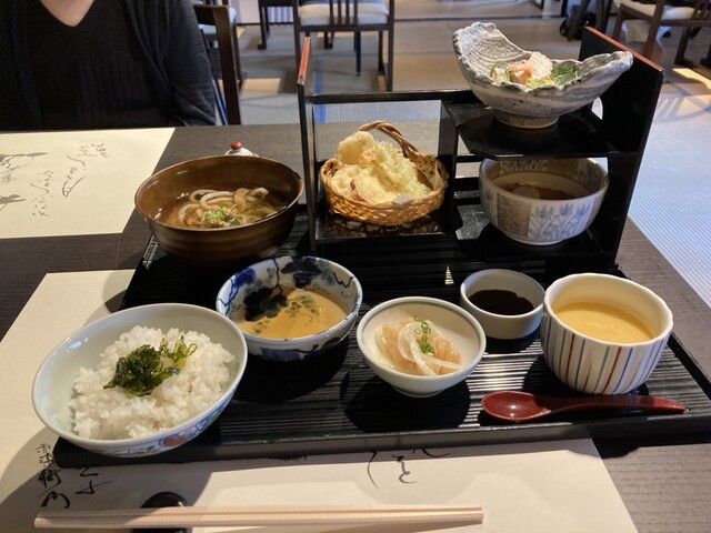 併設のカフェに寄る予定でしたので、ランチAにしました。出てきたお料理はお造り、天ぷら、小鉢、酢の物、ご飯に選べるうどんで、かけうどんとキノコのうどんがあったのでキノコのうどんにしました。どの料理も美味しくて豪華でした。