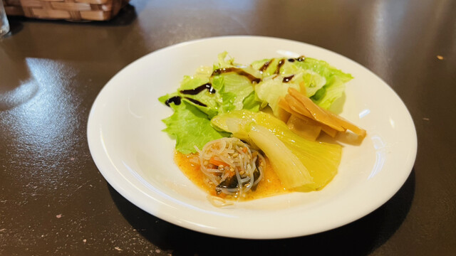 まず運ばれてきたのは、彩り豊かな前菜の盛り合わせ。シャキシャキのレタスに、味の染みたメンマ、ネギの和え物、そして春雨を使った一品は、どれも丁寧に作られているのが伝わってきました。優しい味わいで、メインのラーメンへの期待が高まります。