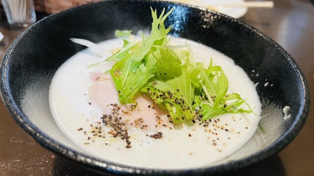 写真を見ていただければわかる通り、真っ白でクリーミーな泡系スープが目を引きます!こんなラーメンは初めてで、見た目からテンションが上がりました。