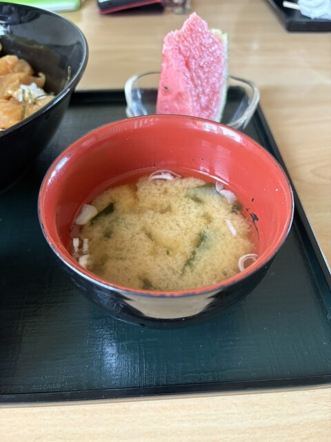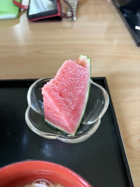 付け合わせには、小鉢にはもやし、きゅうり、ワカメなどの中華風酢の物。小皿にきゅうりの漬物。ワカメのお味噌汁。デザートにスイカ(スイカも鯵ヶ沢の夏の名産品)