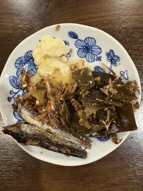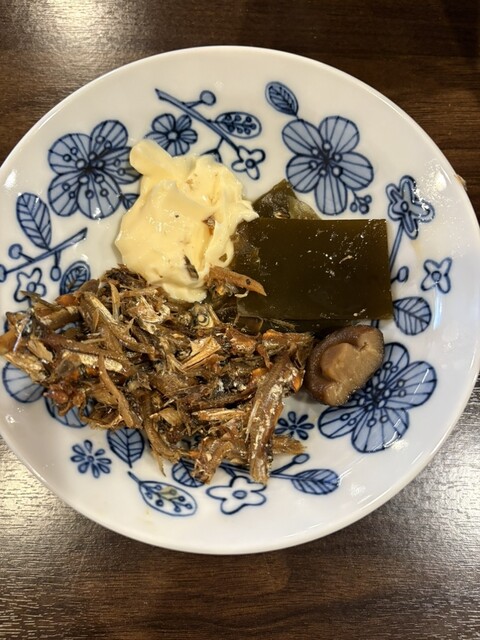 出汁をとった後の煮干しや昆布等を甘辛煮にしたものが自由にどうぞと置いてある。マヨつけると美味しい