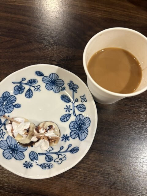 サービスのコーヒーと、いつもはないバナナに生クリームとチョコレートソースをかけたデザート←これもサービス。