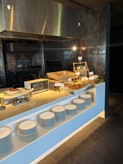 入ってすぐにハムやサーモン、チーズなどの前菜コーナー、お隣にヨーグルトやフルーツ、そしてデニッシュ、温野菜、具を自分で選んで焼いてもらえるオムレツ、スパニッシュオムレツやスクランブルエッグやソーセージやベーコン、サラダなど洋風メニューのコーナーを経て、稲庭うどんやきりたんぽなどと和風朝食のコーナーやドリンクコーナーなど充実満足の朝食です。