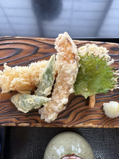 天ぷらの盛り合わせは、海老、ささげ(津軽ではメジャーな隠元を大きく平たくしたような野菜)、南瓜、大葉、束ねた蕎麦を揚げたもの。海老が太くて美味しかったらしい。