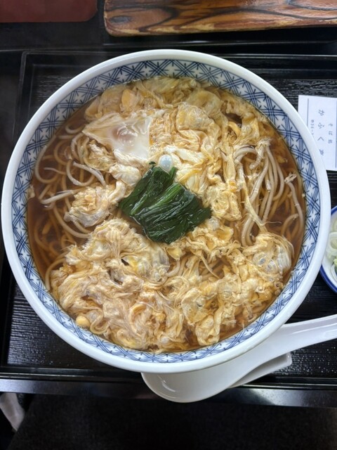 餡で閉じていないタイプの玉子とじで上にはほうれん草がのっており、ネギは小皿に別添えでした。お蕎麦の出汁が優しい味なのでふんわりした玉子がとても合っていました。お腹の底から温まりました。