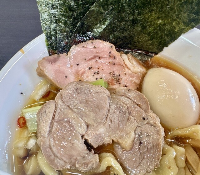 インパクト抜群の極太自家製麺と透き通った綺麗な醤油スープが目を引くらーめん。