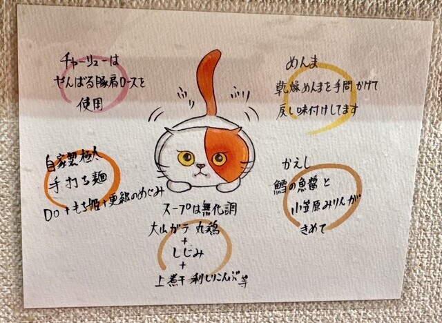 大山鶏の鶏ガラ・丸鶏、しじみ、上煮干、利尻昆布から取った極上の出汁が出たスープに鱈の魚醤、小笠原みりんのカエシで作られたスープは極太の自家製麺にも負けない力強い味わいながら、最後まで飲み干せる程、丁度良いギリギリの塩梅。言語化するのが難しいが奥深く濃いのにしつこくなく後引く味わい…また玉葱のアクセントがスープを飲みやすくあっさりとさせてくれクセになる味。