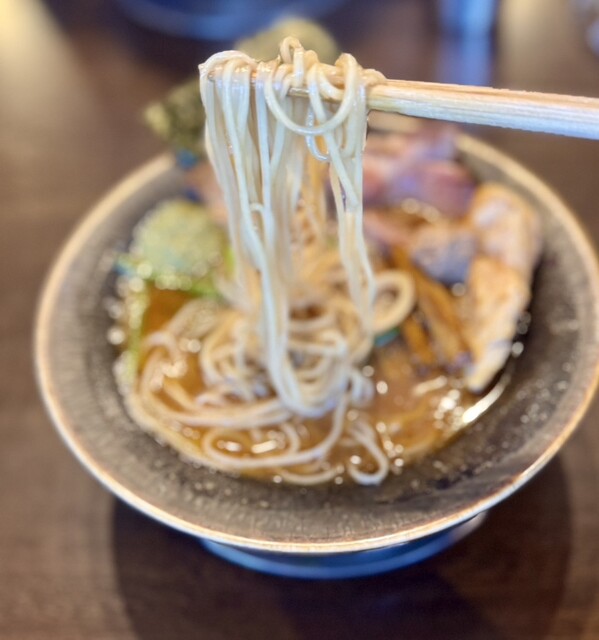 麺は細ストレートでスープとの相性が抜群。引き上げると香味油をまとって麺がキラキラと輝き、麺そのものの香りも良く、美味しい。