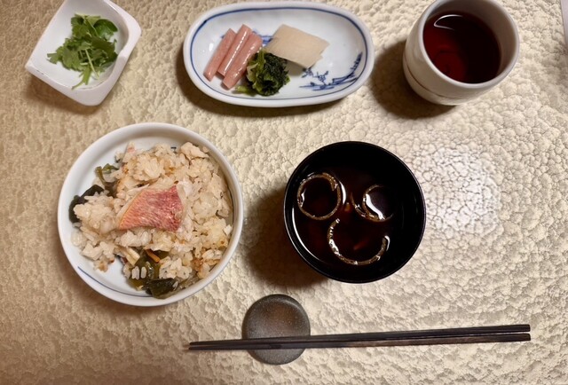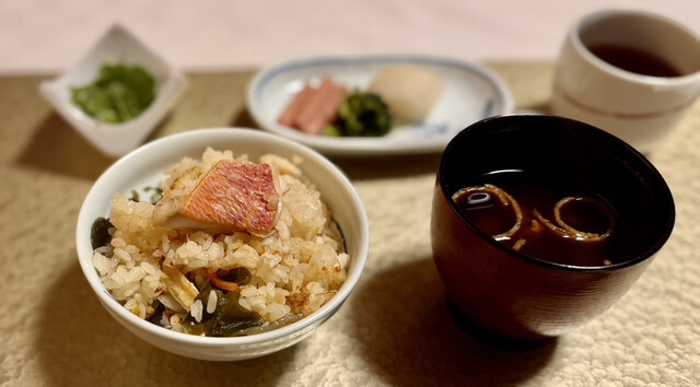 食事 /金目鯛釜飯、赤出し仕立てのなめこ