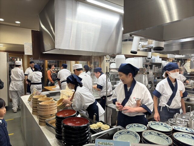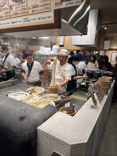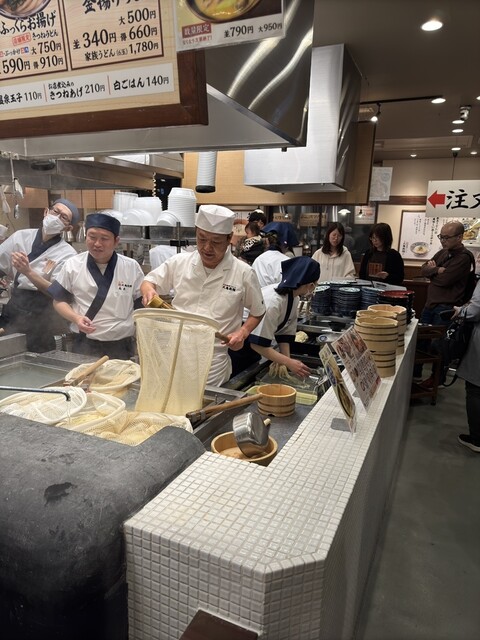 入店すると十数人の麺職人に天ぷら職人、おにぎりの職人もいました。