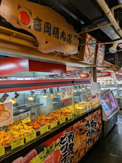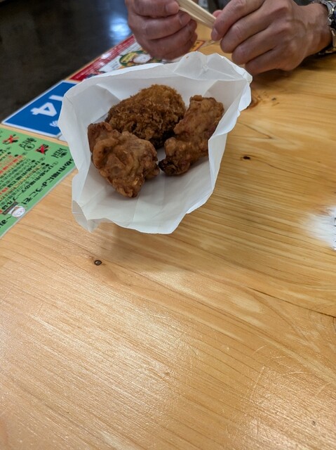 ひろめ市場で、カツオのタタキや餃子待ってる間におつまみをと、唐揚げ、ひろめコロッケを購入。