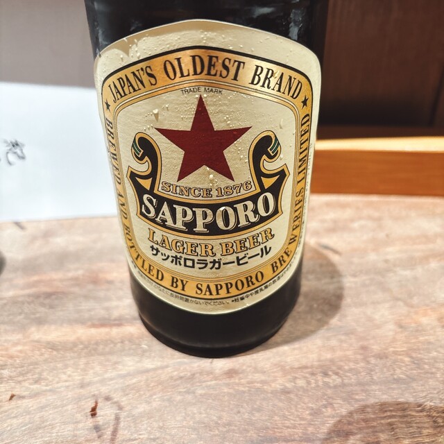 1ヶ月ほど前に予約して訪問。時間通りに着いたので、2階に上がって伝えたら、前の客が帰っていないようで、少し待つことに。2階までの階段で待っていたので、階段途中で装飾の写真を撮っていた。しばらくして案内された。席は2階の焼き場前の特等席をお願いしてあったので、最高の席だった。社長から注文を聞かれ、赤星とお任せをお願い。