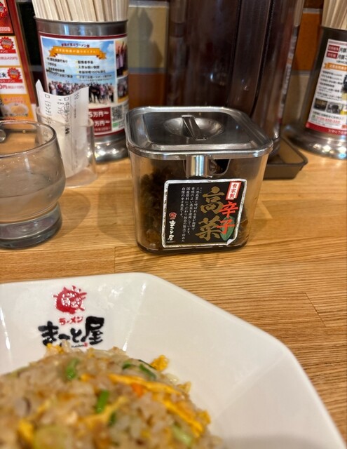 ここに卓上の 高菜を混ぜると塩味と香りが立ち、紅生姜で酸味が加わる。