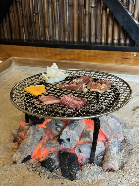 注文したのはあか牛カルビ定食。ほどよく脂がのったあか牛は噛むほどに旨味が広がり、ご飯がどんどん進む味わい。付いてきたダゴ汁もとても美味しく、素朴ながら優しい味が身体に染みわたりました。窓の外には阿蘇山ではないものの雄大な山の景色が広がり、囲炉裏の温もりと自然の眺めが相まって心から癒されました。阿蘇観光の合間に、ほっと一息つける郷土料理のお店です。