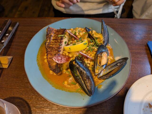 メニューが、ショートパスタのフレーグラ以外はいつも違う。フレーグラはムール貝、牡蠣などシーフードがいっぱい。イカのソーセージと言うのを食べた。デザートもどれもおいしいけどいち推しはレモンパイ。