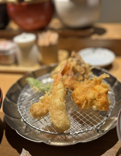 吉祥寺にある金子屋さん。今回は1階の天ぷらめし。海老を2本、イカのかき揚げ、ししとう、舞茸、たまごを1回目。海老2本と鶏の大葉巻き、カボチャを2回目。海老4本を2回に分けて揚げてくださるのが嬉しい!アサリの味噌汁がついて1650円。2階の天丼の店舗とは違う箸休めは3種とも美味で食べ放題。時により変わるとのお話でした。今回は貝柱の柚子和え?でご飯が進んじゃいました…天ぷらを待つ間に。ご飯もピカピカモチモチで大満足です。揚げたて最高!心遣いあふれるお店です。