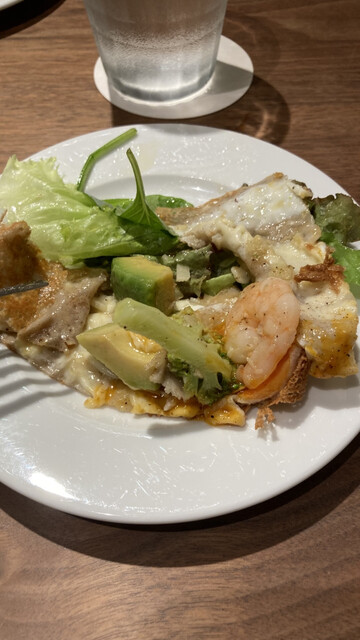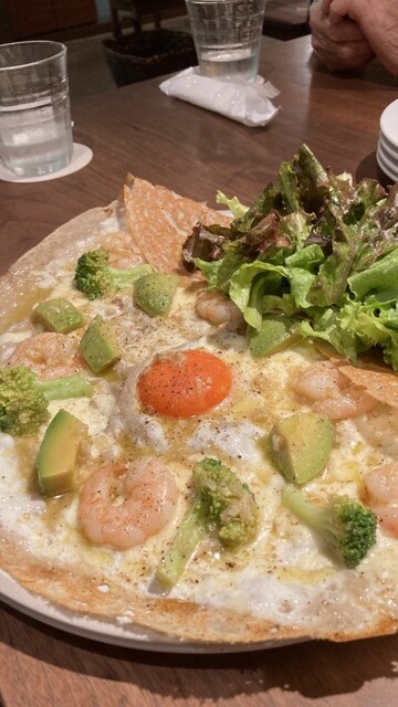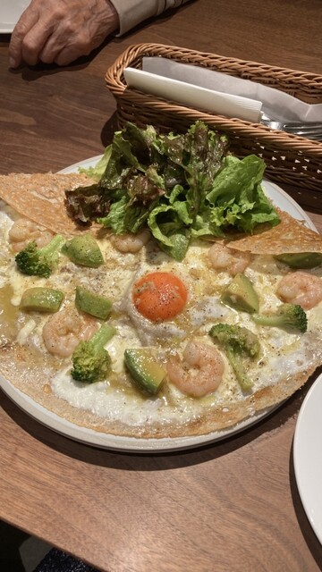 ガレットは黄身の優しい風味がチーズと生地と混ざりマイルドな味わいに…エビとアボカドで歯応えもしっかりあって4人で分けてもかなり満足できるガレットでした!